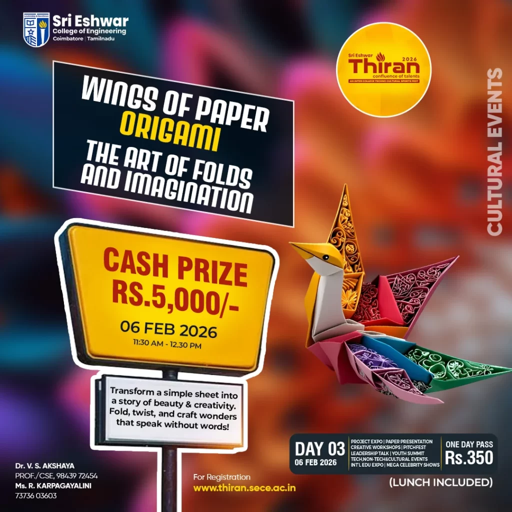 CFL – Thiran – Confluence of talents https://thiran.sece.ac.in Thiran 2026 is an Inter College Techno-Cultural-Sports-Fest conducted by Sri Eshwar College of Engineering. Thu, 08 Jan 2026 04:18:29 +0000 en-US hourly 1 https://wordpress.org/?v=6.9.1 Wings Of Paper – Origami – The Art of Folds And Imagination https://thiran.sece.ac.in/wings-of-paper-origami-the-art-of-folds-and-imagination/ https://thiran.sece.ac.in/wings-of-paper-origami-the-art-of-folds-and-imagination/#respond Thu, 04 Dec 2025 07:23:11 +0000 https://thiran.sece.ac.in/?p=26366